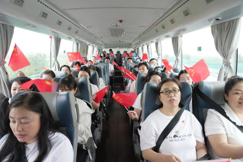 临发车前,大家在车上唱起了《没有共产党就没有新中国》,歌声激荡,一行数辆车,满载着金木人对红色教育基地的憧憬,从安国出发,向着西柏坡的方向行驶。