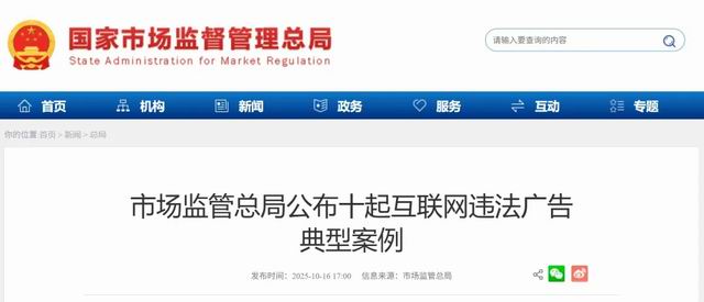 10月16日,国家市场监督管理总局公布十起互联网违法广告典型案例,此次公布的案例涉及私域直播虚假宣传、AI虚假广告、产品功效与实际不符等。