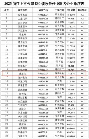 近日,“2025浙江上市公司ESG绩效最佳100名企业”名单正式发布,康恩贝股份列第16位,ESG级别AA-。