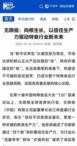 在第十届中国特殊食品大会“T20”圆桌论坛上,无限极全球首席执行官、无限极(中国)有限公司副董事长俞江林直面行业关切,表示“信任不仅是商业基石,更是一种关键的新质生产力”。他系统阐述了无限极通过 “四个新”来积蓄信任生产力,为行业从“流量争夺” 转向“价值共创”提供了深层思考。