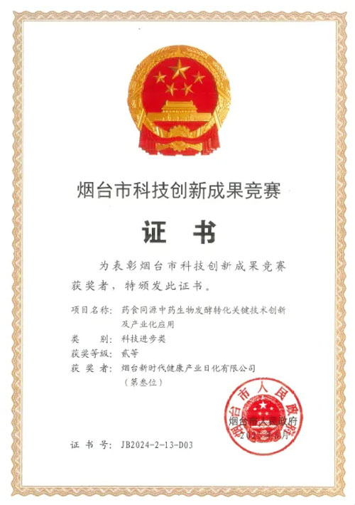 近日,2024年度烟台市科技进步奖评审结果公示,烟台新时代健康产业有限公司(以下简称:烟台健康公司)、烟台新时代健康产业日化有限公司(以下简称:烟台日化公司)与滨州医学院共同申报的项目《药食同源中药生物发酵转化关键技术创新及产业化应用》,成功获评为2024年度烟台市科技进步二等奖。