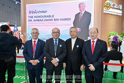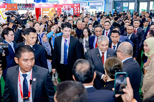 在MIHAS展区开幕仪式上,马来西亚副首相拿督斯里阿末扎希(YAB Dato' Seri Dr. Ahmad Zahid Hamidi)亲临现场并主持剪彩。他强调,进博会是马来西亚企业拓展国际市场、深化与中国经贸合作的重要平台。马来西亚与中国的合作不仅限于贸易,更植根于互信、共同繁荣与深厚的人文纽带,这也是首次将马来西亚顶级清真展MIHAS带到上海的原因。他鼓励马来西亚企业借助这一机遇,进一步推动优质产品走向世界。随后,副首相特别参观了CNI长青集团的展位,与集团高层进行了亲切交流,并对CNI的产品研发与市场战略给予了高度评价。副首相的到访,不仅是对CNI的肯定,也为马来西亚企业在中国市场的发展注入了信心。