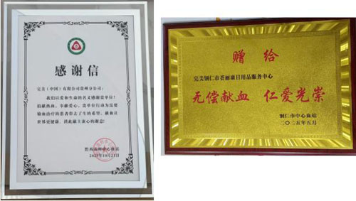 活动开展期间,黔西南州中心血站为完美贵州分公司送上了饱含敬意的感谢信;铜仁市中心血站为当地服务中心颁发了“无偿献血 仁爱光崇”的牌匾,对完美贵州分公司凝聚爱心力量,长期支持无偿献血事业所做的积极贡献表达了诚挚的感谢。