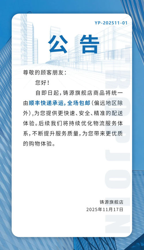 铸源公告:旗舰店商品将统一由顺丰快递承运