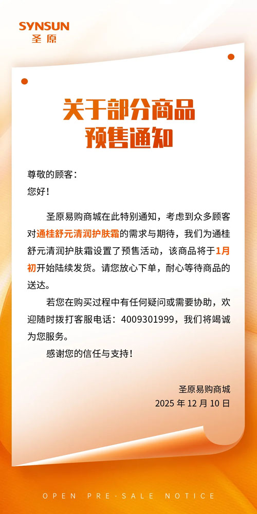 圣原发布关于通桂舒元清润护肤霜预售通知