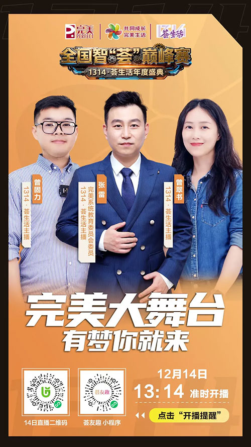 三位“1314·荟生活”巅峰主播,不仅实时解读赛事的每一个精彩瞬间,更将与我们一同见证全国优秀完美人的精彩展业故事。在这个彼此照耀、共同成长的温暖舞台上,共度一个紧张又热烈的下午!