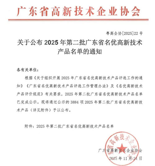 为进一步提升企业产品质量和市场竞争力,推动企业自主创新发展,近日,广东省高新技术企业协会发布了《关于公布2025年第二批广东省名优高新技术产品名单的通知》。