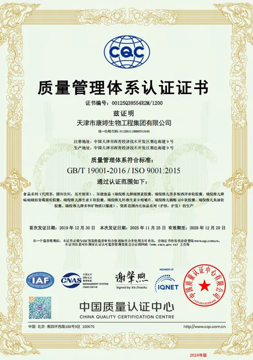 在安全生产制造方面,康婷集团食品、保健食品共计7个生产车间,均获得HACCP管理体系认证注册证书和ISO9001质量管理体系认证,符合国家标准要求,为消费者提供食品和保健食品的安全保障。同时,康婷集团还从研发中心、品质管理中心、检测分析中心等多个环节落实安全主体责任,完善风险防控机制。2019年11月,检测分析中心通过中国合格评定国家认可委员会(CNAS)认可。集团始终将保护消费者的合法权益作为企业的首要责任,用产品的质量给予消费者高层次的生活品质,用产品的温度温暖消费者的心灵。
