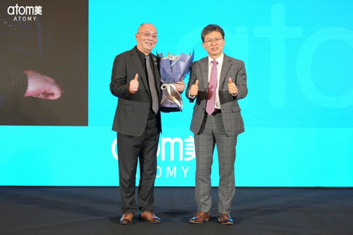 亚太区首席执行官、艾多美(中国)有限公司董事长朴炳宽为其佩戴首席领导人俱乐部蓝色宝石的天鹅徽章。