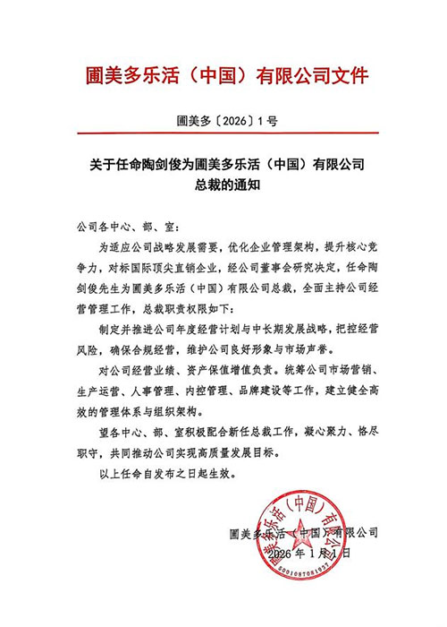 当前,中国健康消费市场正迎来品质升级与需求细分的双重机遇,消费者对 “健康、自然、乐活” 的生活理念追求日益迫切,而直销行业也逐步迈向国际化、高质量发展的新阶段。为精准适配市场与行业发展趋势,锚定国际视野,夯实本土根基,建立 “顶层统筹 + 高效执行” 的现代化管理体系,即日起,圃美多乐活(中国)有限公司正式宣布核心人事任命:陶剑俊先生荣膺公司总裁一职,全面执掌中国市场战略规划、业务运营及品牌发展等核心管理工作,肩负起引领品牌深耕本土、赋能健康生活升级的重要重任。
