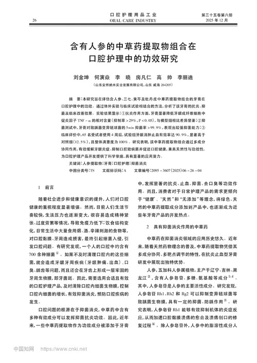 近日,安然集团核心科研成果《含有人参的中草药提取物组合在口腔护理中的功效研究》正式刊登于《口腔护理工业》期刊(2025年12月,第三十五卷第六册),用细胞实验、体外抑菌、人体临床三重严苛验证,全面解锁中草药口腔护理的核心密码,为行业提供科学范本,更为消费者带来权威认证的健康解决方案。