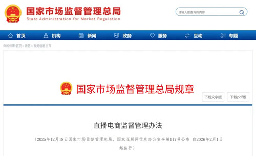 1月7日,国家市场监督管理总局、中央网络安全和信息化委员会联合发布《直播电商监督管理办法》(以下简称《办法》),加强直播电商监督管理,保护消费者和经营者合法权益,促进直播电商健康发展。该《办法》自2026年2月1日起施行。