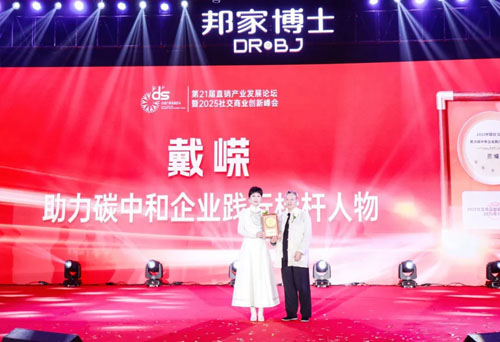 戴嵘总裁更是凭借自身在助力碳中和领域的杰出贡献,被组委会评选为“2025年度助力碳中和——企业践行标杆人物”。中国社交商业创新峰会组委会主席、中国世界贸易组织研究会营商环境研究专业委员会主任胡远江教授现场授牌并给予肯定。