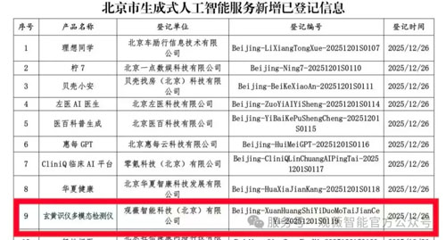 “玄黄识仪”正式通过了生成式人工智能服务(AI产品)登记审核,并取得唯一上线编号。相关公告已在北京市网信办官方网站发布。这标志着该产品在服务能力、数据安全与合规性建设方面达到国家《生成式人工智能服务管理暂行办法》要求,获准面向互联网用户提供全功能服务。