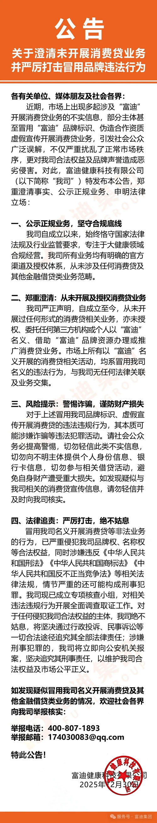 富迪澄清未开展消费贷并严打冒用品牌行为
