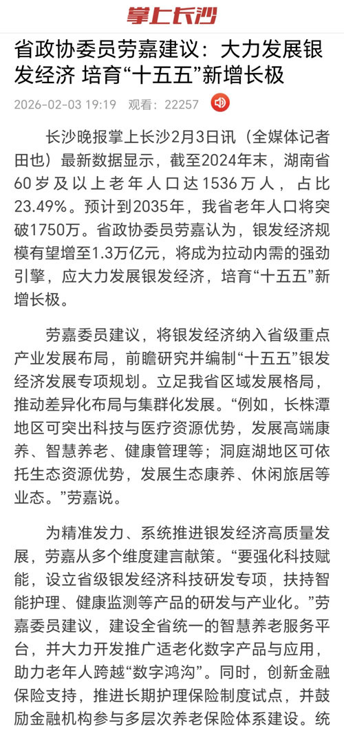 - 劳嘉建议:大力发展银发经济 培育新增长极