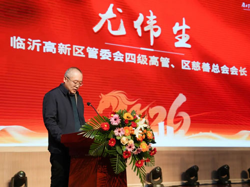 临沂高新区管委会四级高管、区慈善总会会长尤伟生讲话。卫康作为区重点培育和支持的高新技术企业,始终坚持科技引领、创新驱动,已成为区健康产业的标杆和旗帜。