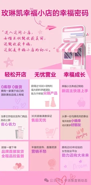 渠道革新:“幸福小店”打造专属零售闭环。2021年,玫琳凯正式推出“幸福小店”线上零售平台,开创了美妆行业“个人专属店+公司强背书”的创新模式。美容顾问仅需158元低门槛即可开通个人专属店铺,无需囤货、不承担发货压力,由公司统一负责物流配送与售后服务,真正实现“零库存轻运营”。这一广受喜爱的创业平台荣膺2021麒麟国际广告奖。