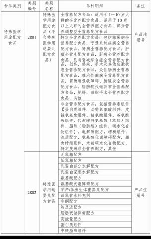 第二条特殊医学用途配方食品申证类别名称分为:特殊医学用途配方食品(不含特殊医学用途婴儿配方食品),类别编号2801 ;特殊医学用途婴儿配方食品,类别编号2802 。特殊医学用途配方食品生产许可食品类别、类别名称、品种明细等见表1。