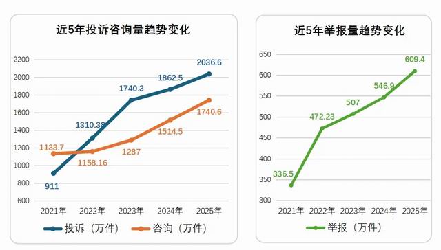2025年,全国市场监管部门通过全国12315平台、电话等渠道共受理消费者投诉、举报和咨询4386.6万件(投诉举报2646万件,同比增长9.8%),其中投诉2036.6万件,同比增长9.3%;举报609.4万件,同比增长11.4%;咨询1740.6万件,为消费者挽回经济损失43.5亿元,有力保护了消费者合法权益。主要呈现十大特点: