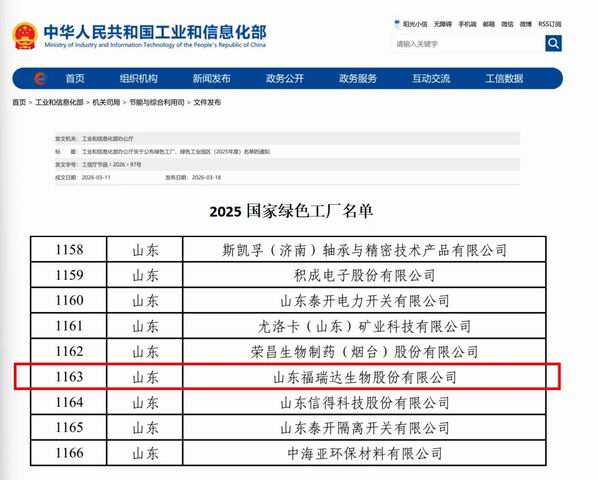 福瑞达生物入选2025年度国家级绿色工厂