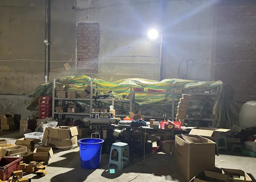 (以下为公司查获的某制假工厂现场图——原料随意堆放,无任何消毒设备,卫生条件严重不达标)