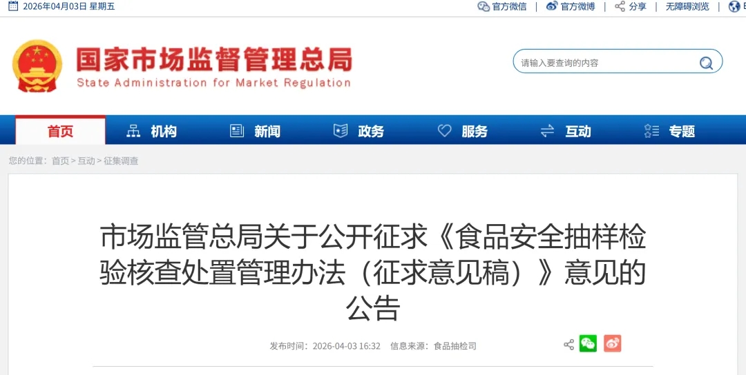 4月3日,国家市场监督管理总局对《食品安全抽样检验核查处置管理办法(征求意见稿)》公开征求意见,意见反馈截至5月3日。