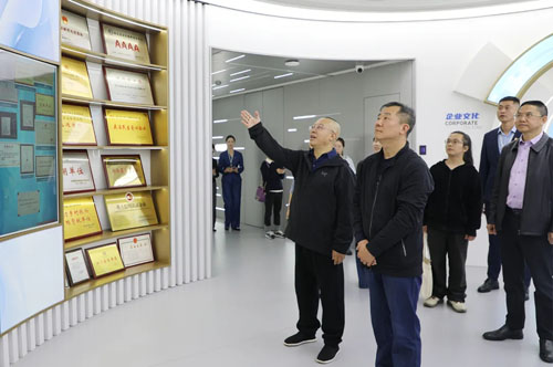 调研组一行循着企业发展脉络,先后参观了绿之韵中心数智化科技展厅、党建教育阵地、人大代表联络站及政协委员工作室等核心区域,进行了全方位、深层次的实地考察。在数智化科技展厅内,“水之道” 设计理念将东方 “上善若水” 的哲学智慧与前沿数字技术深度融合,通过沉浸式交互系统,全面展现企业发展历程、全链条产品体系、行业领先的科研成果,以及在公益助学、乡村振兴等领域的扎实实践,立体呈现出企业的创新活力、产业实力与社会担当。