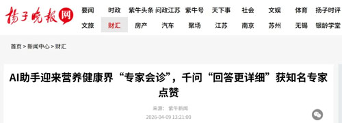 下面是扬子晚报的报道《AI助手迎来营养健康界“专家会诊”,千问“回答更详细”获知名专家点赞》,推荐大家读一读~