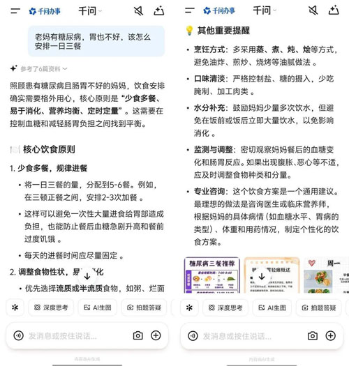 李阿姨今年68岁,糖尿病加上消化功能减弱,每天吃什么成了全家的难题。她儿子给她下载了一个ai应用(886108),输入“老妈有糖尿病,胃也不好,该怎么安排一日三餐”,得到的回答让她儿子有点惊讶——不仅列出了饮食原则,还具体到“早餐可以把白粥换成杂粮粥加鸡蛋羹”“烹饪方式优先蒸煮炖”“蔬菜切细煮软”。