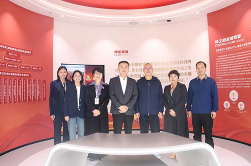 调研组一行先后参观了绿之韵中心数智化科技展厅、党建教育阵地、人大代表联络站及政协委员工作室等核心区域。在数智化科技展厅内,“水之道”设计理念将东方“上善若水”的哲学智慧与前沿数字技术深度融合,通过沉浸式交互系统,全面展现企业发展历程、全链条产品体系、行业领先的科研成果,以及在公益助学、乡村振兴等领域的扎实实践,立体呈现出企业的创新活力、产业实力与社会担当。在党建教育阵地,刘云书记详细介绍了企业自2006年成立党支部以来,逐步构建的以党组织为核心、工会与公益基金会协同的党建新生态,系统阐述了“三色三有三亮”建设及“一融合、双培养、三引领、四坚持、五到位、六强化”工作法。在政协委员工作室,胡国安董事长重点介绍了该阵地作为港澳委员联络站、委员联系群众平台,以“书香+履职”模式倾听民声、服务群众的创新举措与实践成效。