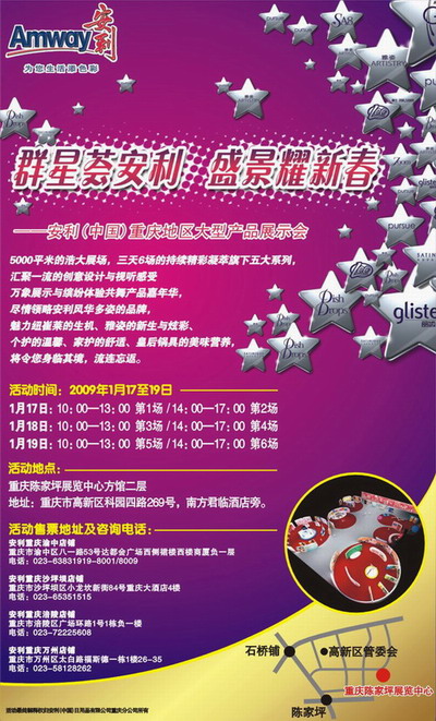 1月17日~19日,安利重庆地区大型产品展示会即将在陈家坪展览中心隆重举行,占地5000平方米的展示厅,会描绘出一幅“安利为您生活添色彩”的生动立体画卷。