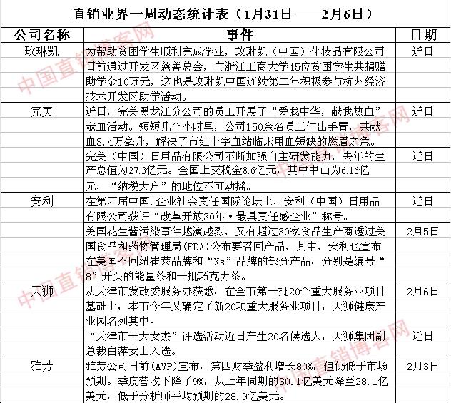 直销界一周动态统计表(1月31日—2月6日)
