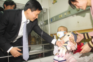 陈怀德先生通过河北省慈善总会向10名白血病患儿捐赠60万元。图为陈怀德先生探望患儿。