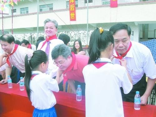 溪山镇中心小学为中山市领导和企业家系红领巾