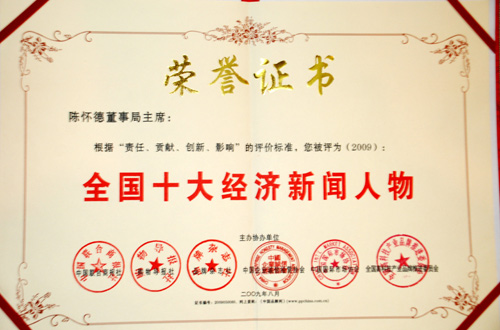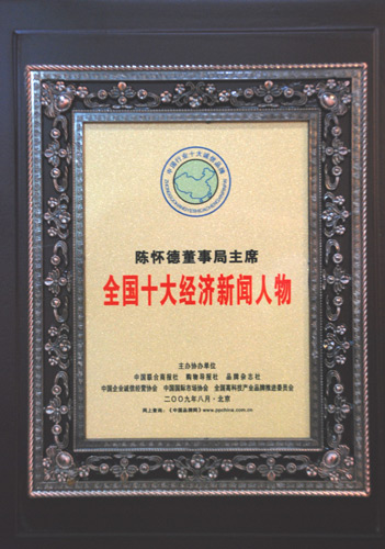 评选中,陈怀德主席凭借近年来在全球市场以及慈善公益领域的突出表现,得到了活动评委会的一致认可,与广西玉柴机器集团有限公司董事局主席晏平等知名企业家一起,被授予“2009全国十大经济新闻人物”的荣誉称号。