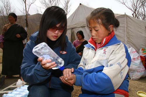 安利志愿者用公司的净手凝露给灾区孩子洗手