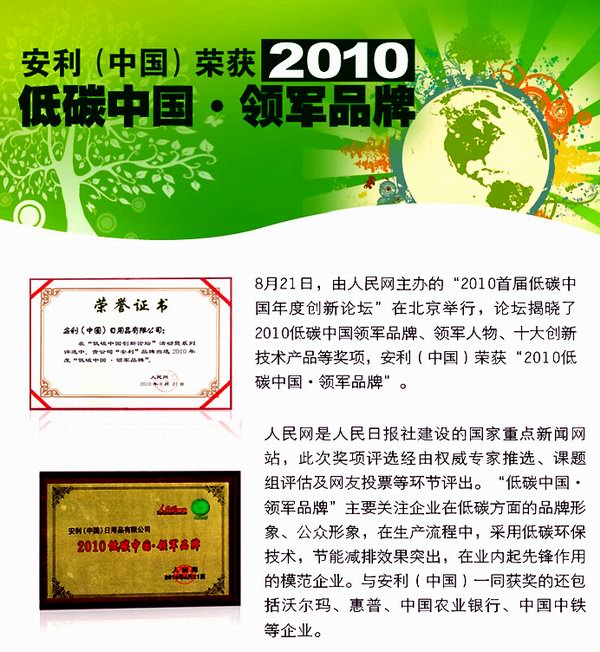 安利(中国)荣获“2010低碳中国.领军品牌”