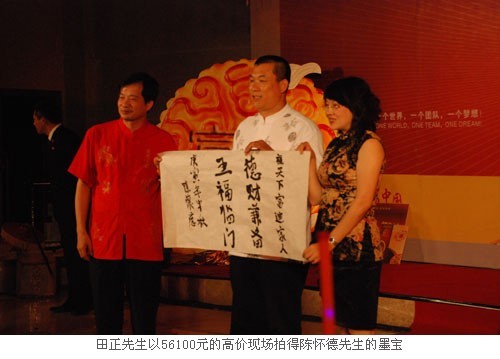 随后,陈怀德先生还现场挥毫,写下对天下富迪人的美好祝愿——德财兼备,五福临门。其墨宝还现场进行拍卖,拍卖所得将作为善款通过广东省富迪慈善基金会捐给需要帮助的弱势群体。经过一轮紧张的角逐,最后,富迪资深营销精英田正先生以56100元的高价拍得这幅字,全场家人为其喝彩,掌声经久不息。