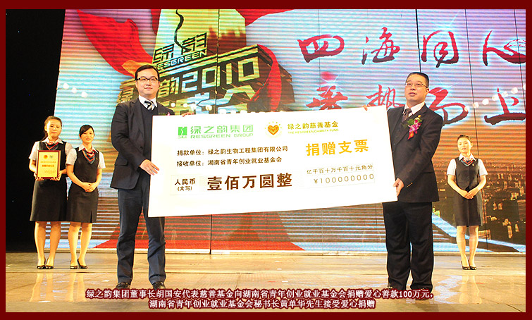 承担责任,奉献爱心,回馈社会,造福国家——这是绿之韵慈善基金一直倡导的理念。年会之际,绿之韵人的爱心接力也没有停歇,绿之韵集团胡国安董事长代表慈善基金向湖南省青年创业就业基金会捐赠爱心善款100万元,湖南省青年创业就业基金会秘书长黄单华先生接受绿之韵的爱心捐赠,并向绿之韵慈善基金颁发爱心牌匾。