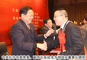 据市委市政府【2010】20号文件精神,长沙市第三届优秀中国特色社会主义事业建设者评选,由长沙市委、市政府成立“长沙市优秀中国特色社会主义事业建设者”评选表彰活动领导小组,由市委副书记、常务副市长谢建辉任组长;市委常委、副市长张迎龙,市委常委、统战部部长虢正贵任副组长;领导小组成员由市委统战部、市发改委、市经委、市人事局、市工商局、市工商联等单位主要负责同志组成。通过各区县(市)委、高开区工委、经开区工委、市工商联党组及市直有关单位推荐,提名人选共57名,经16个市直部门进行评审后,应用“非公有制经济代表人士综合评价体系”进行综合评价,评选活动领导小组根据综合评价的等次级别和企业的综合实力,确定35名候选人接受公众投票。公众投票截止后,根据得票数进行排序接受专家评审。历经数月的公众投票和专家评审,绿之韵集团董事长胡国安以强烈的创业意识和开拓精神,诚信守法、关爱社会,以“致富思源、富而思进”,自觉把自身企业的发展与国家的发展结合在一起,把个人富裕与全体人民的共同富裕结合在一起,成为了长沙现代化建设中的优秀代表,荣获“长沙市第三届社会会主义优秀建设者”称号。现场,长沙市政府副市长张迎龙给胡国安董事长颁奖,优秀的经销代表现场见证了这一光荣时刻。