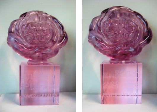 图片介绍:玫琳凯中国出席“美丽影响力”——首届腾讯网美妆大赏颁奖盛典。会上,玫琳被评选为“最具影响力公益品牌”,玫琳凯舒颜洁面产品荣获“最具影响力洁面产品”,图为腾讯网颁布的奖杯。