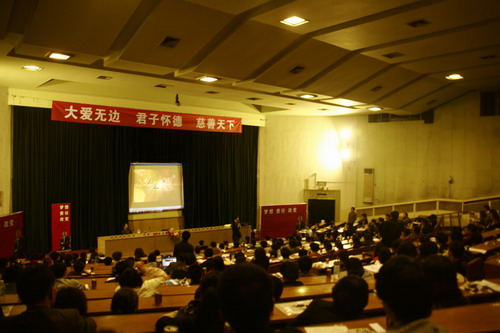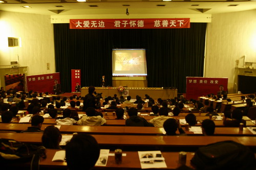 演讲中,陈怀德先生从大学生关心的就业问题谈起,从宏观层面剖析国家、社会支持大学生创业的深远意义,更从成功创业家的角度为高校学子带来寄语。他以自身的成长历程激励当代大学生积极面对人生,勇于创新、敢于创业。艰苦的童年、大学时代的创业经历和故事、在商界创造的一次次辉煌与奇迹……这些都深深地震撼了在场的每一位听众。在讲到企业的社会责任时,陈怀德先生传递了旗下企业一贯以来的把“利”变成“爱”的企业经营理念。“粉丝带飘起来”大型公益活动,援助汶川、玉树灾区,救助白血病儿童,援建希望小学,资助贫困学子……其旗下企业的每一个善举都在实践着真正的“大爱无边,慈善天下”。