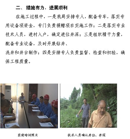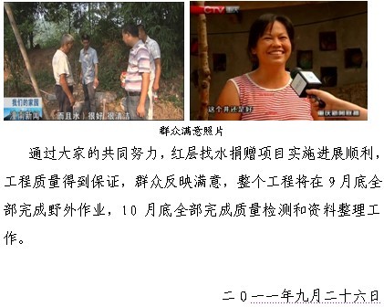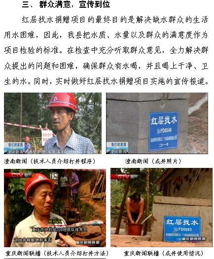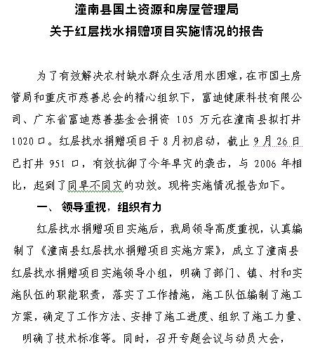 潼南县国土资源和房屋管理局在“关于红层找水捐赠项目实施情况的报告”中,特别对富迪爱心井项目进行了总结,并给予高度肯定。
