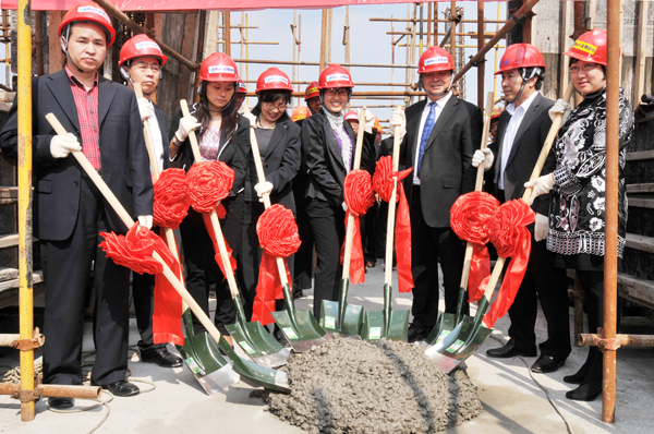 陈惠董事长一行分别前往一层、十六层、二十一层和楼顶参观,他向大家介绍了财富金融大厦的基本情况,该大厦建成后将成为具备银行、商务等综合功能的高级金融写字楼,必将为能达商务区建筑群添上浓墨重彩的一笔。最后,在财富金融大厦楼顶,陈惠董事长和优秀经销商代表共同浇筑最后一方混凝土,标志着财富金融大厦顺利封顶。