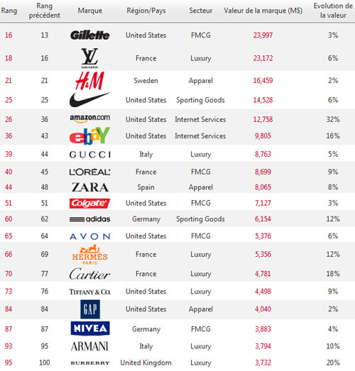 路易威登虽然下跌两级,仍然以第18排名名列前二十强。古琦,爱马仕,卡地亚,蒂芙尼则分别上升三至七位。阿玛尼上升至93位,紧接其后的是排名第95的巴宝莉。