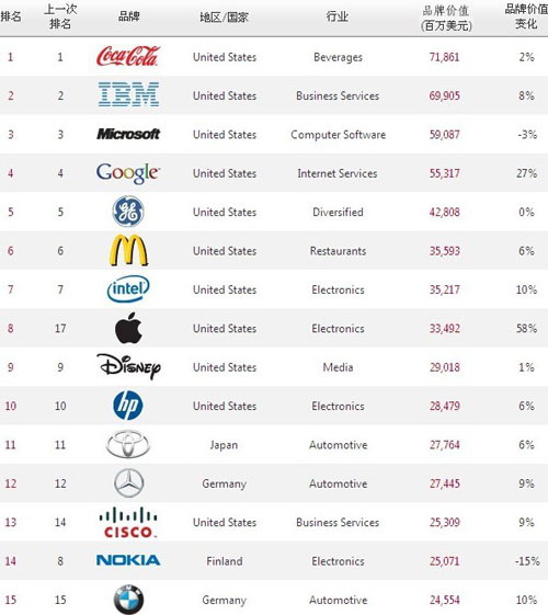 苹果从去年的第17位跃升至第8位,品牌价值勐增58%。惠普牢守第10位,诺基亚则从去年的第8位滑落至第14位,品牌价值缩水15%,也是TOP100内跌幅最大的品牌,跌幅第二、三的分别是是日本的任天堂(-14%)和索尼(-13%)。雅虎从去年的第66位跌落至第76位,品牌价值缩水11%。