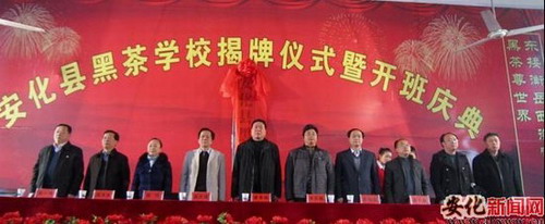 县教育局局长王煜辉致辞。他说,得天独厚的地理环境,底蕴深厚的梅山文化,赋予了安化黑茶独一无二的保健功效和无穷魅力,深得国内外茶人喜爱。县委、县政府高瞻远瞩,将其纳入“3+2”发展战略,作为县域经济的支柱产业来培育和打造。安化黑茶的异军突起,引起了中央和省、市各级领导的高度重视,并指示安化建立一所专门的黑茶学校,以培养黑茶产业技术人才,弘扬安化黑茶文化,提升产业核心竞争力。成立安化黑茶学校,旨在培养黑茶种植、制作、营销、研发和黑茶文化与旅游资源开发的技术人才和管理人才,进一步推广新理念、新方法、新工艺、新技术,不断提高从业人员整体素质,为黑茶产业发展提供人才保障。他表示,安化黑茶学校将致力建设成为国内一流的安化黑茶人才培养培训中心、产品研发中心和文化推广中心。