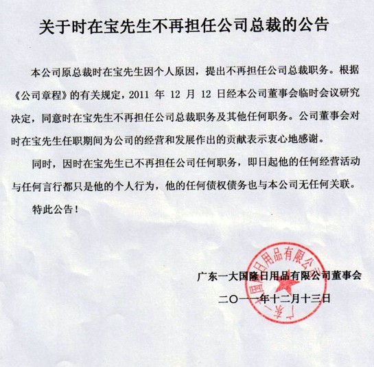 2011年12月19日,广东一大国隆日用品有限公司官网公布了一项人事公告。公告称:原公司总裁时在宝先生因个人原因提出辞职,根据《公司章程》的有关规定,2011年12月12日经本公司董事会临时会议研究决定,同意时在宝先生不再担任公司总裁职务及其他任何职务。公司董事会对时在宝先生任职期间为公司的经营和发展作出的贡献表示衷心地感谢。