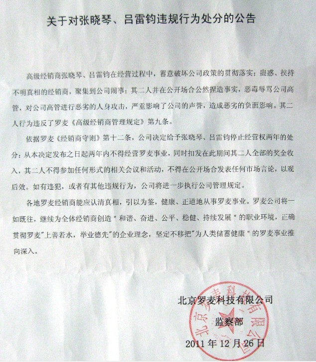 罗麦公司公告处分张晓琴吕雷均 停权两年